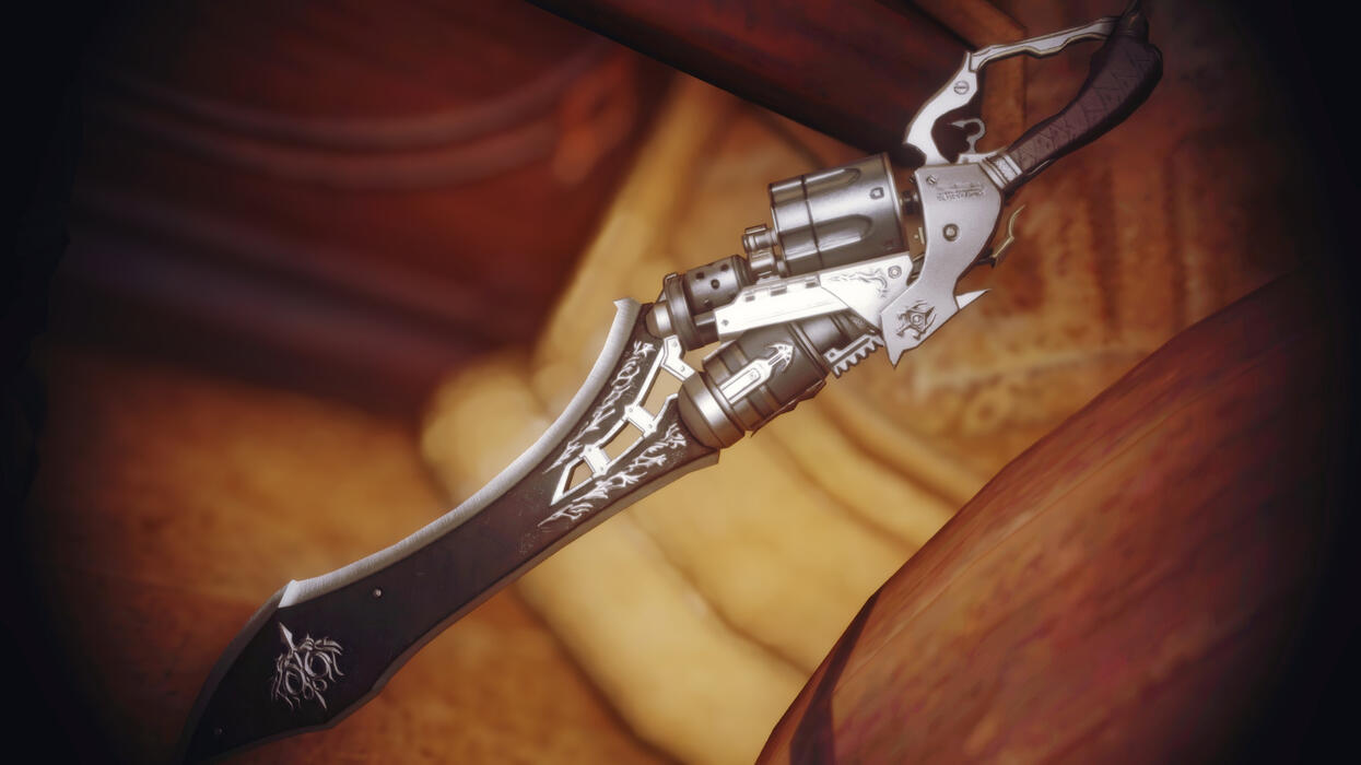 At his back rests an imposing gunblade of his own creation, its frame housing a sophisticated magitek engine. This masterwork of engineering serves as both weapon and tool, capable of manipulating environmental / personal / and hostile aether through mechanisms known only to its creator. The weapon's complexity hints at the depths of his technical expertise, even as its worn grip speaks to frequent use. There are words carved onto the blade's fuller;